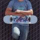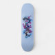 trabalho de arte colorida de um dragão de cor azul e flores roxas crescendo de um galho de árvore em um skate.