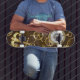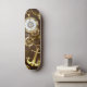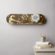 Fundo de madeira castanho com fundo marinho, cordilheira mecânica, volante antigo, âncora de ouro e diversas engrenagens de ouro e latão. Estilo Steampunk.