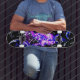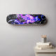 um trabalho de arte de espaço decorativo que apresenta uma nebulosa de espaço cor roxa com planetas e luas que emergem do espaço negro num skate.