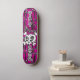 Crânio bonito e bósforos com arco sobre fundo roxo colorido com estrelas pontilhadas pela polca e texto de SKATE GIRLY.