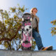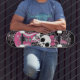 Crânio feminino e bósforos com guitarra arco e rosa é um perfeito design de skate para as senhoras.