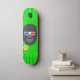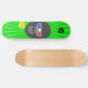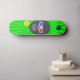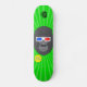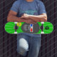 Um skate que tenha um gorila do estilo dos desenhos animados vestir os vidros 3d com um fundo verde.