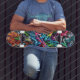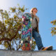 Skate Graffiti Streetart auf Ziegelwand mit Skyline