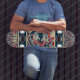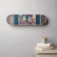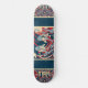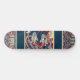 This Japanese inspired skateboard design includes koi fish in a red, navy, and light blue "election poster" style, with a coordinating kaleidoscope psychedelic pattern at the top and bottom, with navy and gold accents in between. The ocean is a tribute to the famous Great Wave off Kanagawa artwork by Hokusai with swirling waves and stylized seafoam.