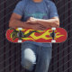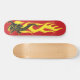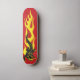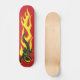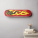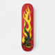 Este lagarto preto e amarelo é colocado em chamas amarelas com fundo vermelho. Este réptil divertido faz um skate colorido.