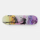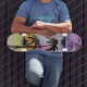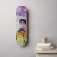 um trabalho de arte decorativo de aquarela de palmeiras crescendo diante de um pôr do sol colorido enquanto algumas gaivotas voam por aí com um bom efeito mosaico em um skate