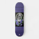 skate de marca Dd, feito em preto e roxo, com gráficos de uma noiva esquelética com flores roxas, no meio do conselho. Ambas as extremidades do conselho são feitas em um padrão listrado roxo e preto.