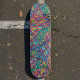 Este vibrante e atraente design multicolorido com muitos mostra como é decorativo este skate.