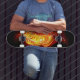 Pena de pavão brilhante feita de fogo e chamas sobre fundo negro.