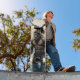 Tabuleiro de patins. Um Sasquatch muscular com uma águia pousando em seu ombro enquanto ele percorre um rio em uma floresta.