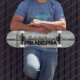 Aqui está a bela linha do horizonte de Filadélfia, vista do outro lado do rio Delaware, cidade de Camden. As nuvens se pendura no céu tempestuoso, e as reflexões dos arranha-céus são vistas na água.