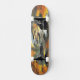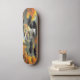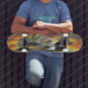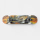 Um design de arte das rochas, impressões de pés, areia e piscinas rochosas na praia ao pôr do sol.