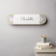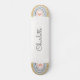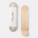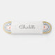 Um arco-íris branco personalizado estilo "boho", mostarda azul, rosada e giro, estilo "mostarda azul", em cada extremidade do skate, com um pequeno coração cor-de-rosa no meio.