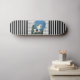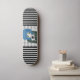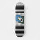 Um skate legal com riscas brancas e negras ousadas e modernas, um padrão de gingham legal e uma personagem de gengibre com um tablet nas mãos com um adesivo de símbolo de paz.