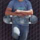 Skate da sarja de Nimes - confortável e quebrado dentro apenas como seus pares de jeans favoritos. Um design dos retalhos do brim azul pockets, rasgos, furos e desvanece-se.