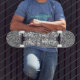 Este skate é telhado com os desenhos do crânio do açúcar e um lembrete para vestir um capacete no texto do divertimento.
