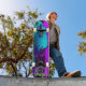 "ARKN: softcorp" : Emboscada em chaleira elétrica, o texto enigmático na base do conselho chama almas curiosas. É uma corporação? Uma ordem clandestina? Ou talvez ambos — um coletivo subterrâneo que trafica sonhos e metamorfose. As letras torcem, se invertem, um enigma para aqueles que se atrevem a andar. Rodas do Futuro: As rodas — amarradas por neon, sossegadas — giram como as engrenagens esquecidas do tempo. Eles carregar o peso de inúmeras viagens: de becos a santuários de telhados, da realidade a reinos aumentados. Cada revolução promete transformação — uma chance de se libertar ou ser consumida. O Violet Veil: O baralho do skate, uma canvas de roxo da meia-noite, captura a essência de mil sonhos virtuais. Ela vislumbra iridescência, como se fosse tecida a partir de poeira estelar e código com brilho. A própria cor sussurra de memórias esquecidas e realidades fraturadas. No seu coração, surge um personagem anime — uma fusão de humanos e máquinas. O cabelo esmeralda desafia a gravidade, um cometa verdiano que atravessa o conselho. Olhos, luminosos e enigmáticos, guardam segredos que possam reescrever destinos. Seus membros cibernéticos carregam cicatrizes de batalhas travadas em domínios além da tela.