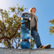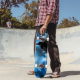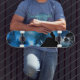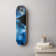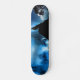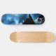 Um skate que caracterize um lobo que urra em uma rocha constante. O conselho é na maior parte azul, com algumas máscaras pretas
