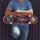 A plataforma legal do skate tem um trio dos crânios do estilo do tatuagem em um vermelho ao fundo de Borgonha. Na parte superior há um crânio dos doces do divertimento com os quatro rosas em cores do pop. No centro há um crânio mau que veste um tophat roxo. Há dois rosas de cada lado com um corvo apenas abaixo. Abaixo do esse é uma bandeira que leia, "deixou-a rolar." O terceiro crânio tem acentos azuis, presas, e três rosas.