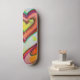 Detalhe de pintura de dois corações da pintura "Laugh". Os corações são amarelo, laranja, pêssego, rosa, magenta, e vermelho. A mídia é aquosa com brilho de vidro.