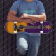 La patineta presenta el diseño de una guitarra acústica, ofreciendo una fusión creativa entre la funcionalidad del deporte urbano y la estética musical. El diseño contiene los trazos curvos y las líneas elegantes de toda guitarra, mientras que los colores y patrones añaden un toque artístico y vibrante. Esta patineta no solo proporciona un medio de transporte ágil, sino que también sirve como expresión artística, capturando la esencia melódica y creativa de la música en su diseño.
