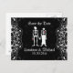 Casal de noiva e do esqueleto gótico Salve os cartões postais de data. Esqueletos muito bonitos com noiva e noiva, salve o texto da data e o nome da noiva e do noivo e os cartões postais de data de casamento. Preencha com o tofat, gravata, véu e coração!Excelente e muito singular dave os cartões postais de data para o seu Casamento de Halloween, Gótico ou Casamento de Tema!