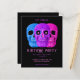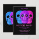 Cabeça de crânio engraçada Gótica cor-de-rosa púrpura azul preto estilo pop de arte Halloween Festa de aniversário RIP Para seus convites de cartão plano de orçamento de 20 s. Divertido, aniversário de 30 anos assustador. Três crânios design com olhos paternais. Trendy, única, assustadora, inspirada moderna. Imagem copyright Marg Seregelyi Fotografia.
