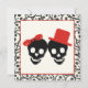 Crânios elegantes convite para o casamento vermelho do Halloween, apresentando uma noiva de casal do crânio preto e noiva sobre fundo de marfim e uma borda do padrão do crânio. O noivo veste um chapéu vermelho e a noiva um arco vermelho.