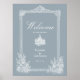 Make a refined and unforgettable first impression for your wedding day with this elegant dusty blue vintage ornate frame wedding welcome poster, featuring a delicate line-art floral border, a sophisticated decorative frame, and a custom vintage building illustration at the center. This timeless design blends classic wedding elegance with a touch of French country charm, making it the perfect addition to your wedding entrance, ceremony space, or cocktail hour.