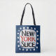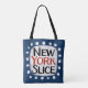 Um design de mensagens tipográficas divertidas e bonitas que diz "Nova York Slice". Ele tem texto preto e vermelho em um retângulo branco com pontos brancos engraçados e brincalhões ao seu redor, tudo em um fundo azul.