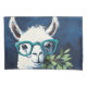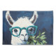 Playful twist to cute animal art and humor with a quirky white llama rocking teal glasses and holding a leafy branch.