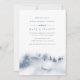 O convite para a festa de noivado de inverno apresenta um fundo de aquarela que representa uma paisagem de montanha de neve pontilhada com silhuetas de pinheiros em tons sujos de azul e cinza. Personalize com seus detalhes de celebração de noivados em caracteres de cinza azul-chic. Uma bela escolha para festas de noivado de inverno elegantes em zonas montanhosas ou florestais.