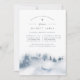 O convite para batismo, batismo ou dedicação a bebês apresenta um fundo de aquarela que representa uma paisagem de montanha de inverno nevada pontilhada com silhuetas de pinheiros em tons de sombra azul e cinza. Personalize com sua cerimônia religiosa e comemorações ou detalhes de festas em caracteres de cinza azul.