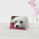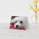 Este cartão apresenta um retrato de Snowdrop, um doce e pequeno Cachorro Maltês a olhar para o hetero da lente da câmara com os seus belos olhos cintilantes escuros.