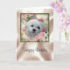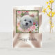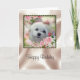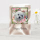Este cartão de aniversário bonito caracteriza Snowdrop, um cão maltês pequeno doce. A imagem é um retrato de sua cara cercada por flores do primavera e por rosas cor-de-rosa em um quadro bonito.