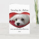 Um cartão de Natal bonito que caracteriza Snowdrop, um maltês pequeno doce na Noite de Natal fora de uma casa na neve com uma Lua cheia.