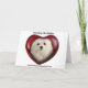 Este cartão de Natal caracteriza Snowdrop, um cão maltês pequeno doce que olha para fora de uma sala com uma árvore de Natal através de uma janela folheada da neve.
