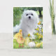 Este cartão de páscoa bonito caracteriza Snowdrop, um cão maltês pequeno doce. Está sentando-se na grama com alguns patinhos pequenos doces, ovos e algumas flores bonito do primavera.