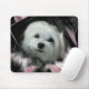 O tapete do rato bonito caracteriza Snowdrop, um cão maltês pequeno doce. Seu retrato é contido dentro de uma criação artística de flores cor-de-rosa e do laço preto que dão à imagem um efeito incomum e dramático.