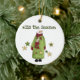 Um boneco de neve com um vestido verde longo e um cachecol vermelho e texto que diz "Esta é a estação" num ornamento de férias de manutenção.