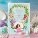 Este convite para o querido apresenta três sereias bonitas e de cor aquática nadando em volta de um quadro de algas que envolve todos os detalhes da divertida festa. A data é destacada por uma concha no centro. O verso deste convite tem um padrão de escala de sereia coordenado. As cores incluem: verde, aqua, turquesa, vermelho, roxo, rosa e azul claro. Você pode personalizar com todos os detalhes do seu partido. Perfeito para o tema "Sob o Mar" ou para o tema "Sereia"!