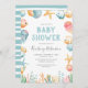 Convites de natação com tema do mar com um simples fundo branco, peixes marinhos tropicais de cor aquática, estrelas-do-mar, peixes-geleia e plantas do mar, e um modelo moderno de chá de fraldas "sob o mar" que é fácil de personalizar.