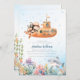 Diversão sob o convite do chá de fraldas marinho com um submarino e um mergulhador. Um adorável polvo, tubarão e minúsculos cavalos marinhos natação no recife de coral! Este convite encantador é perfeito para uma festa temática do mar ou do oceano. Veja a coordenação de itens no nosso compro, Encantado Finch.