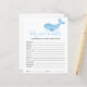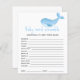 Um pequeno a caminho com este convite de chá de fraldas sob o tema do mar, apresentando baleia bebê em aquarelas moles azuis. Respostas: CRAVINGS, CRYING, PACIFIER, FRASCO, LUZ NOTURNA, LULLABY, STROLLER, EPIDURAL, BURP, ALTA CADEIRA, SACO DE FRALDA, SWADDLE