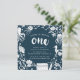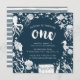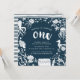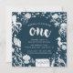 Convites de aniversário Adoráveis da vida marinha para o seu primeiro aniversário apresentam um fundo azul escuro com ilustrações brancas da vida marinha em torno de seus detalhes de festa de aniversário.