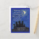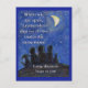 A mensagem do cartão postal anota, "Quando estamos separados, eu lembro que todos vivemos sob a mesma lua. Abraços de longa distância para você". A arte mostra as sombras de três humanos, um cachorro, e um gato olhando para cima em uma lua crescente sob um céu estrelado. A arte foi feita usando lavagens acrílicas seguidas de pastel no papel. trabalho de arte inspiracional de Laurel Latto para DonnaBellas Angels sem fins lucrativos. A missão sem fins lucrativos é fornecer arte inspiradora para o bem-estar mental. O lema é "Medicina cura o corpo, arte cura a alma". Saiba mais online em DonnaBellasAngels.org.