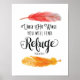 Design de tipografia com caligrafia e glifos com palavras em preto, "Sob suas Asas você encontrará refúgio." O design é centrado entre duas ilustrações de pena de aquarela (vermelha e laranja) no centro superior e inferior do design. Escritura é do Salm 91:4.