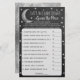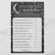 Este jogo "sobre a lua" é perfeito para qualquer um que tenha um chá de fraldas este ano. A design apresenta uma lua prateada com estrelas sobre um fundo de efeito de quadro de quadro de aviso e uma formulação de modelo fácil de personalizar. Simplesmente dê esses cartões de jogo aos seus convidados para jogar no chá, quem estiver mais próximo do custo total real, sem passar, ganha um prêmio de sua escolha!
