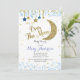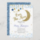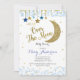Sobre o convite do chá de fraldas da lua para o menino com uma lua, umas estrelas, e um brilho bonito do ouro do falso.
