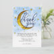 O cartões de agradecimentos chá de fraldas apresenta um fundo de cor azul-d-água brilhante cheio de estrelas brilhantes de ouro e uma lua de sombra dourada.